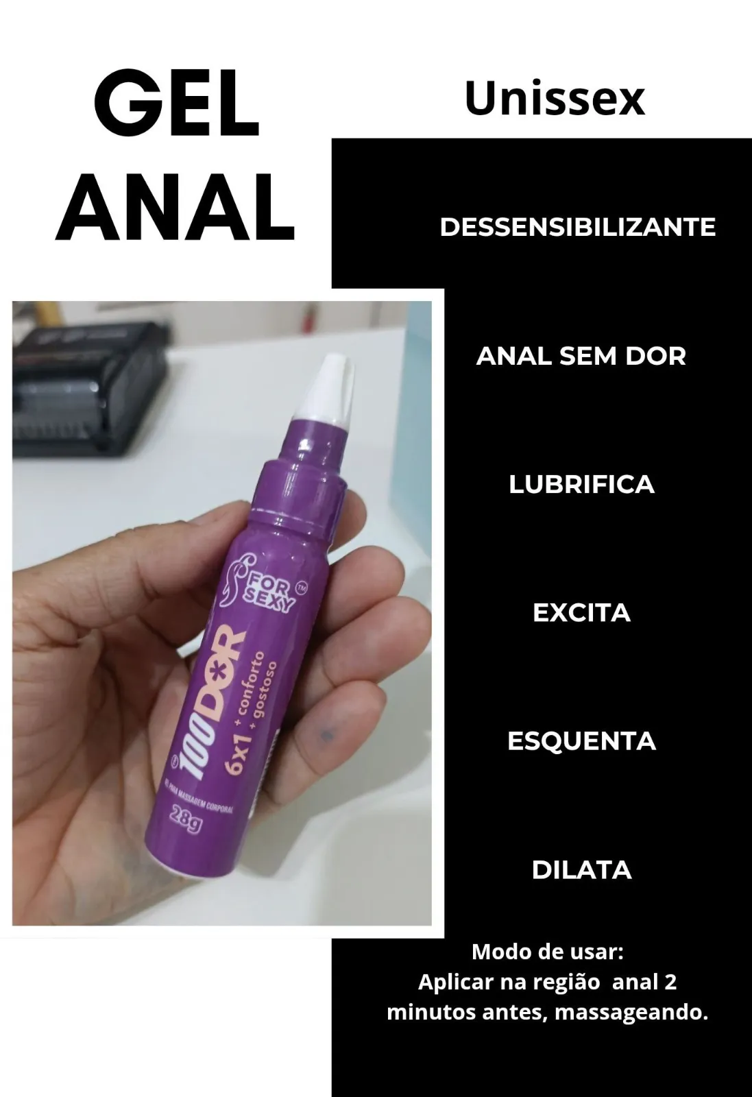 Gel corporal adequado para sexo anal que promove sensações de dilatação. Além de ser dessensibilizante, inibindo todo desconforto, também possui ação cicatrizante para maior conforto durante a penetração.