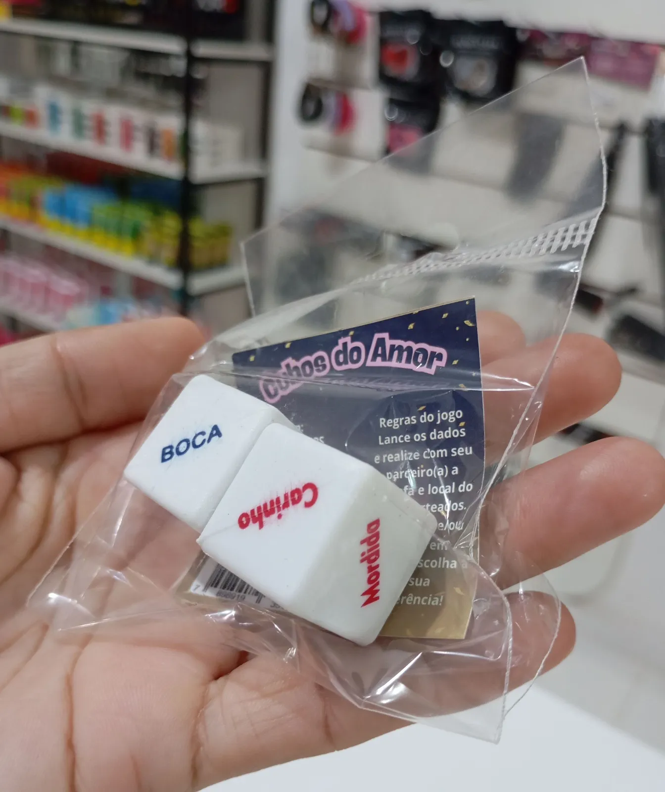 CUBOS DO AMOR, é um Jogo para adultos com 02 cubos impressos, sendo 01 com tarefas MORDER, MASSAGEAR, ACARICIAR, LAMBER, BEIJAR E ESFREGAR, e outro com partes do corpo: COXAS, BUNDA, PEITO, COSTAS, NUCA E PESCOÇO