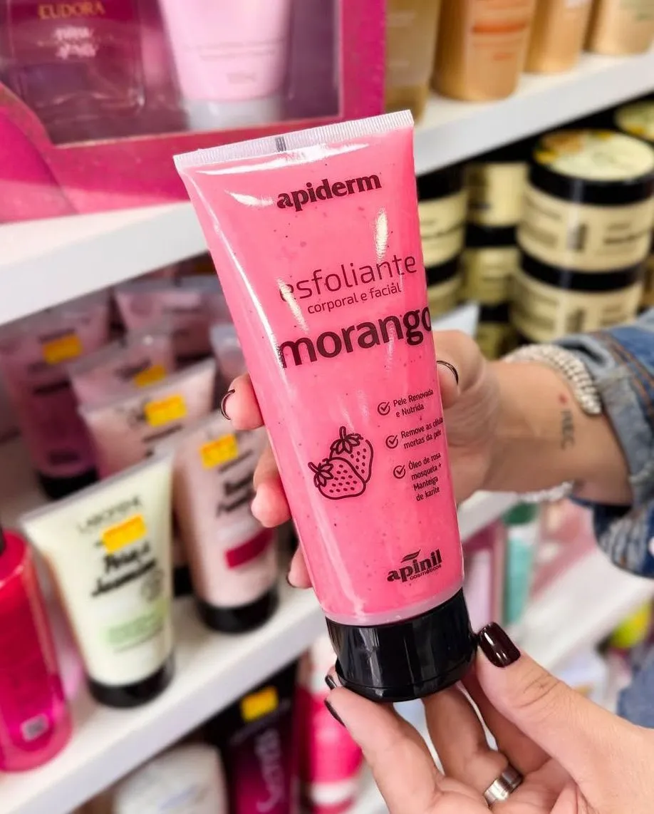 Durante sua rotina de banho, espalhe o esfoliante pelo rosto e corpo úmidos fazendo movimentos circulares e suaves. Enxágue em seguida.