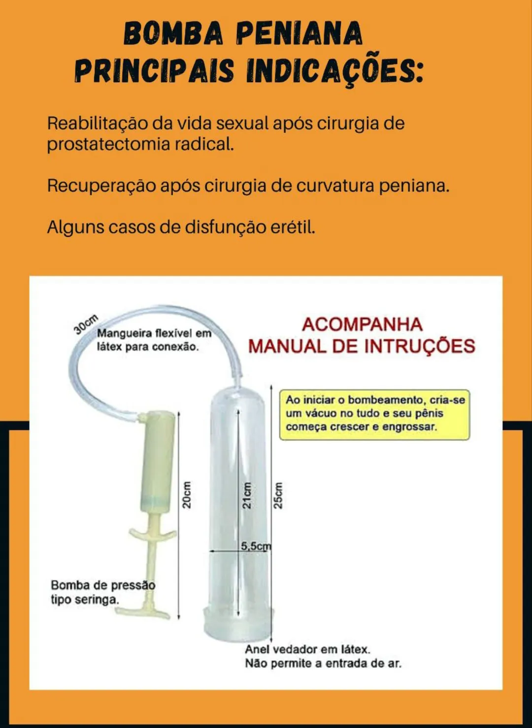 Modo de Uso Certifique-se de que todos os componentes estão limpos antes do uso. Aplique um lubrificante à base de água no pênis e na entrada do tubo para garantir uma inserção suave e confortável. Coloque um dos anéis de silicone na base do tubo da bomba. Insira o pênis no tubo, pressionando-o rente à virilha para evitar a entrada de ar. Utilize o gatilho manual para criar vácuo, ajustando a pressão conforme necessário. Utilize a bomba por 10 minutos diários. Caso sinta alguma fisgada ou dor, interrompa o uso e retome no dia seguinte. Após o uso, libere a pressão, remova o pênis do tubo com cuidado.