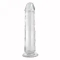 Feito em TPE transparente, apresenta glande definida, textura de veias e ventosa de fixação, ideal para penetrações em ângulo reto com firmeza e praticidade.